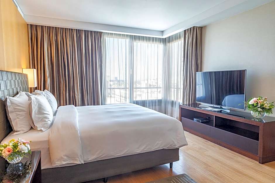 This sleek modern design suite of 75 to 82 square yards features a king bedroom with adjacent bathroom offering bidet area, tub and rain shower, a separate sleeping and living areas, a work area with oversize work desk and guest toilets. It features panoramic views over the Recoleta district, as well as flat-screen TV, designed spa products, wireless and Internet access.