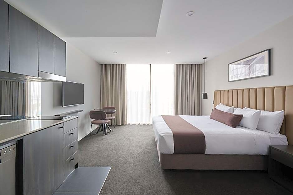Stylishly appointed King Studios feature a king bed or two King Single bed (can be arranged upon Prior Notice only if required) and a kitchenette, refrigerator, cook top and dishwasher. Also provided is a flat screen TV with streaming capabilities, a washer, dryer and Ideology bathroom amenities.