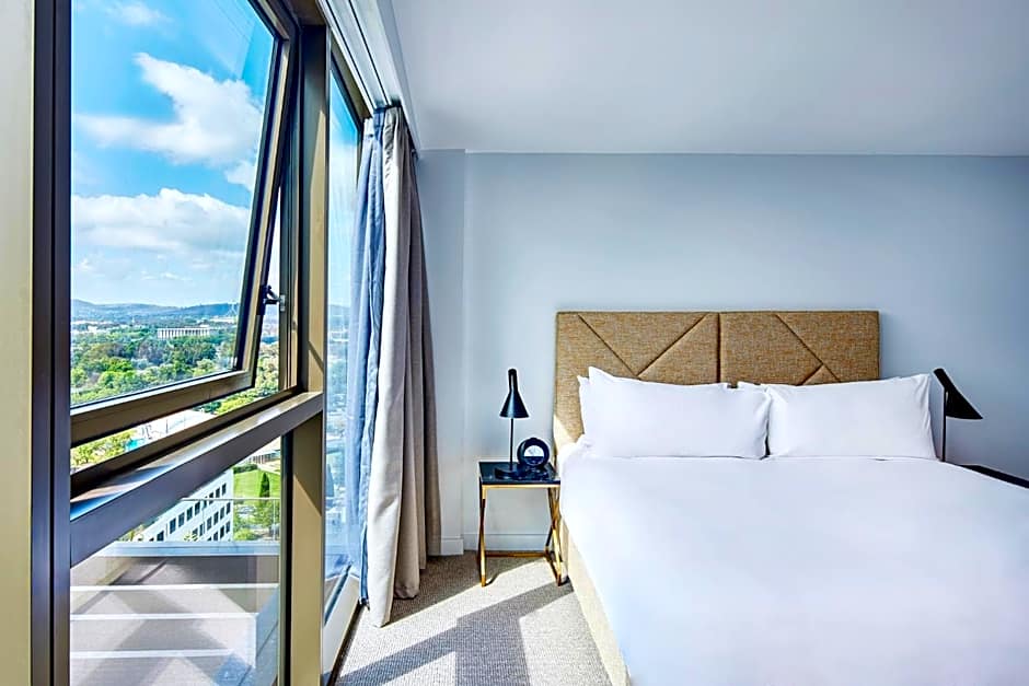Featuring one separate bedroom and private balcony with views over Lake Burley Griffin, this split level suite has a fully equipped kitchen and a laundry with a washing machine and dryer. Guest can enjoy Kevin Murphy bathroom amenities. All suites have STAYCAST by Google Chromecast. Please note that the king-size bed can be split into two single beds.