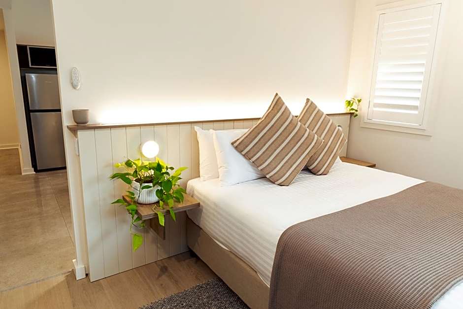 Recently renovated, our One Bedroom Apartment offers a perfect blend of modern comfort and stylish design. This inviting space features a plush queen bed and a private balcony, separate from the living area for added privacy. The well-equipped kitchenette includes a full-sized refrigerator, electric cooktop, microwave, toaster, and tea and coffee making facilities, along with all the utensils you need to prepare a delicious meal—just bring your food and condiments!