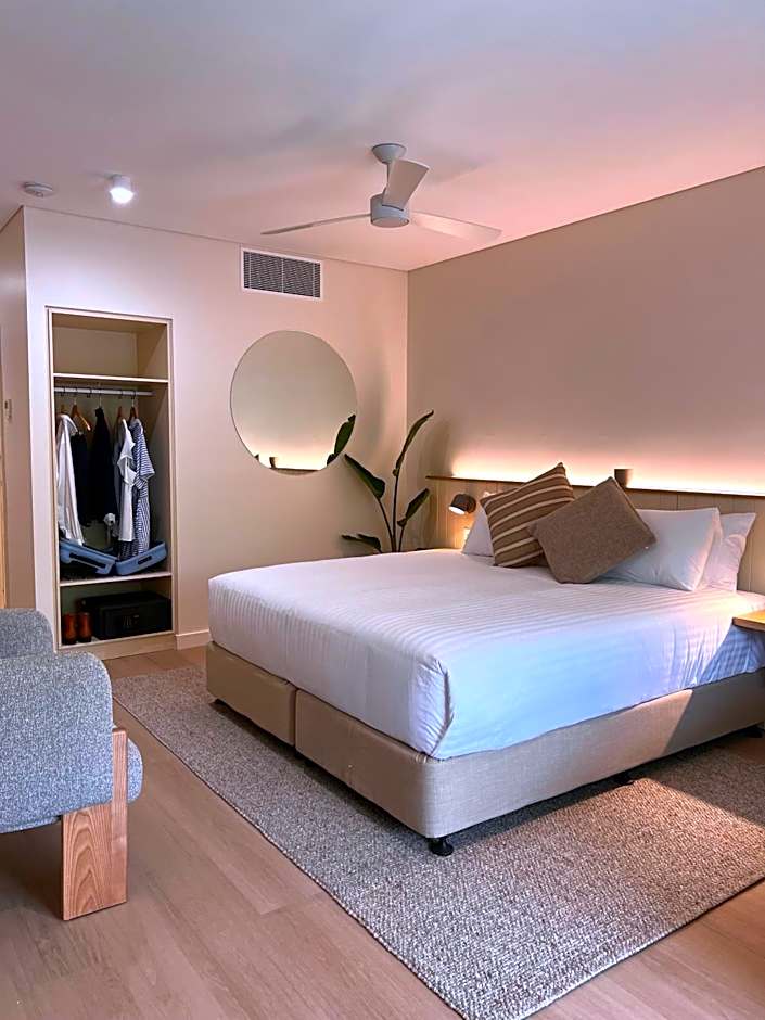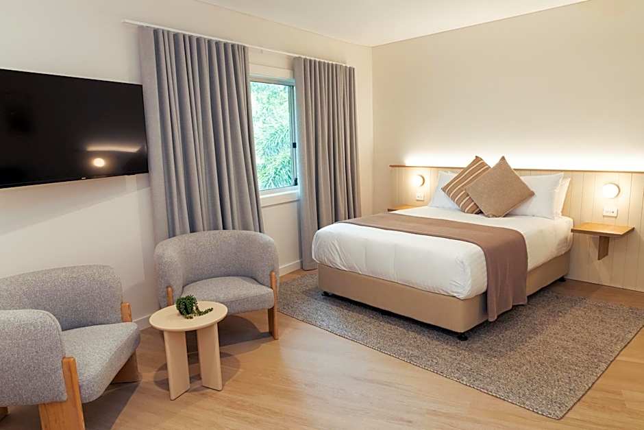 Recently renovated, our Family Room seamlessly blends modern comfort with stylish design to offer a welcoming retreat. This spacious room features a plush Queen bed and two versatile King Single beds, which can be combined into a King bed (upon request). It includes refrigerator and tea and coffee making facilities and a dining table for added convenience. Enjoy a range of entertainment options on the large Smart TV and refresh yourself in the sleek accessible shower. The room is thoughtfully equipped with an in-room safe for your valuables, and efficient air conditioning to ensure your comfort. Additionally, the comfortable chairs provide a cozy space to relax and unwind, making your stay as enjoyable as possible.