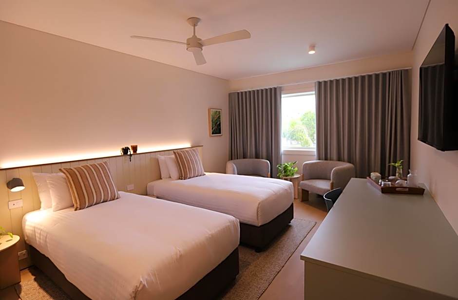 Our Twin Room with Garden View seamlessly blends modern comfort and stylish design to offer a delightful retreat. This spacious room features two luxurious King Single beds and a generously sized desk area, ideal for work or planning your activities. A refrigerator and tea and coffee making facilities are provided for your convenience, ensuring you can easily enjoy your favorite beverages. Each room is equipped with a large Smart TV, an in-room safe for your valuables, and efficient air conditioning to keep you comfortable. The comfy chairs provide a cozy spot to relax, making this room a perfect haven to unwind and enjoy your stay to the fullest.