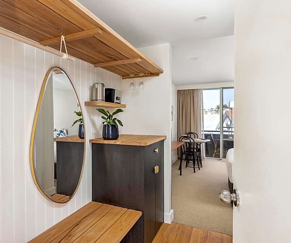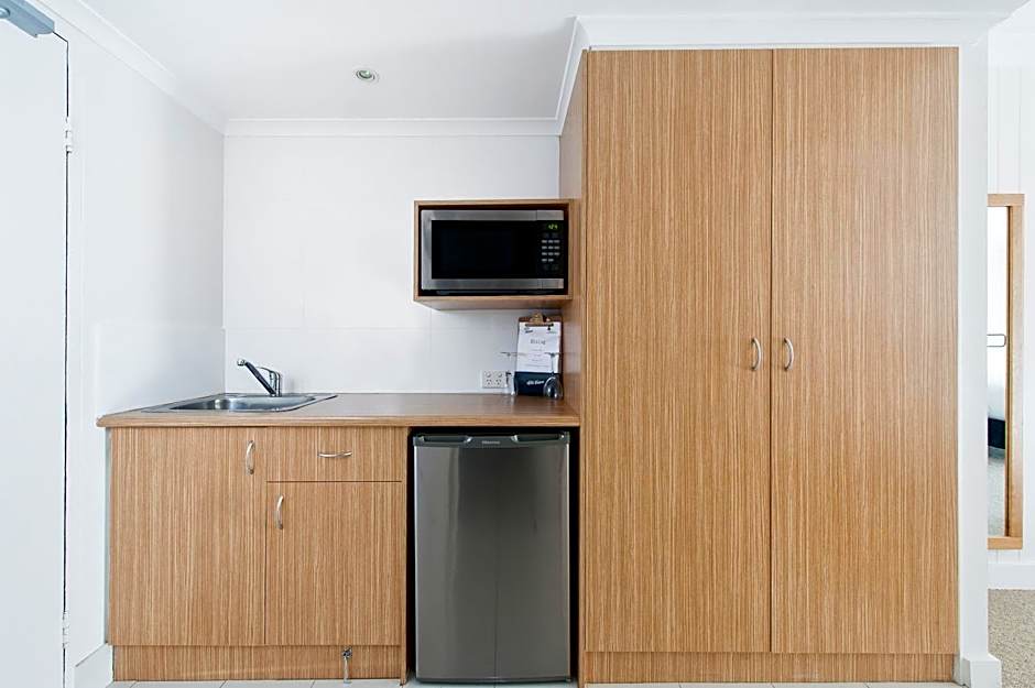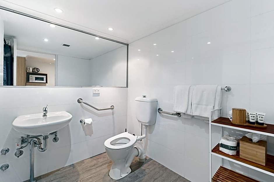 Featuring an open-plan living area and an accessible bathroom with complimentary Biology skincare and stand alone shower. The room has a built in wardrobe, pure wool carpets, LCD TV, air conditioning and DVD player. Kitchenette has a sink, bar fridge, microwave, cutlery, crockery, tea & coffee condiments. Private balcony looks out over the front garden of the hotel. The room is located on the bottom floor with easy access to the parking lot.
