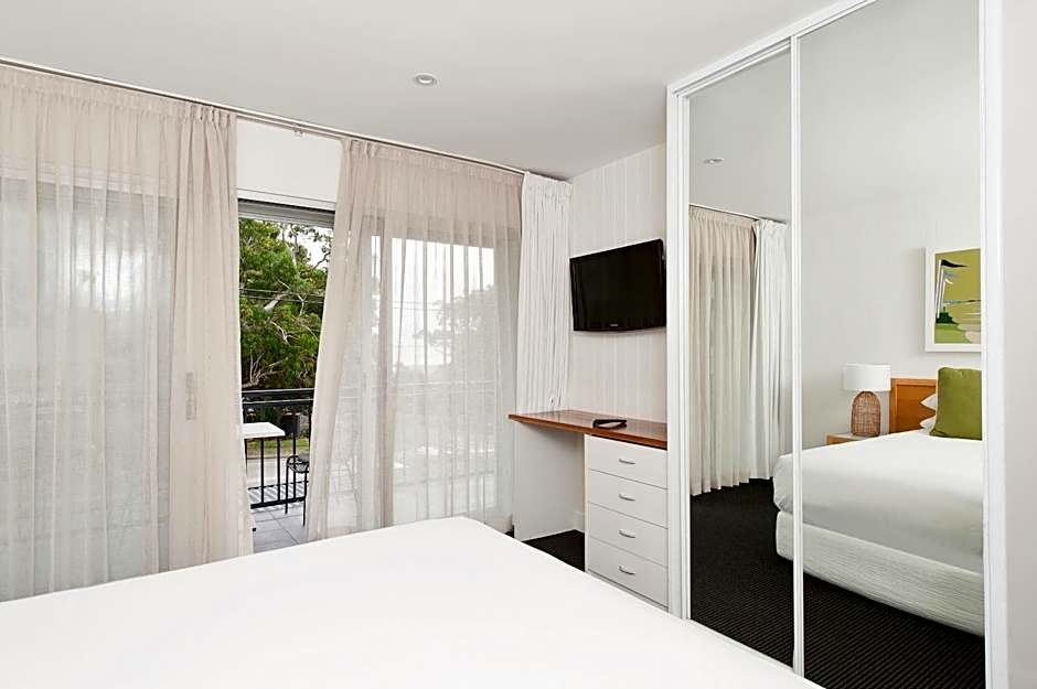 This room includes a king-sized bed. It also includes a flat-screen TV with 8 cable channels, wired internet, WiFi and an iPod docking station. It has a DVD player and a designer bathroom with stone bench-tops and luxury toiletries. It has an armchair, ottoman, dining setting, tea/coffee making facilities, toaster and crockery. A small refrigerator are provided. The balcony has views towards Nelson Bay and partial side marina views.