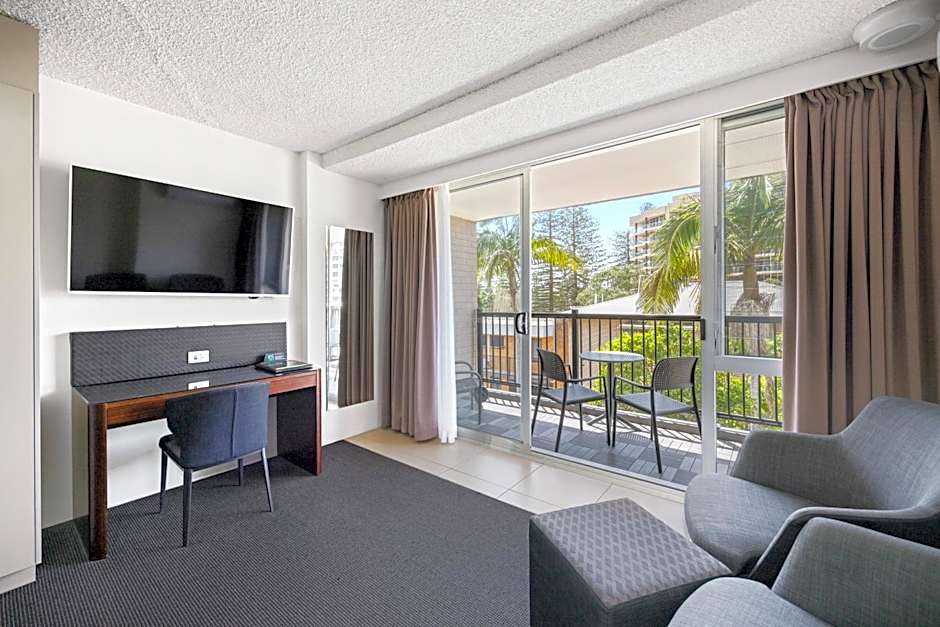 Featuring a private balcony overlooking the outdoor courtyard and pool. There is a separate kitchen and a living room.