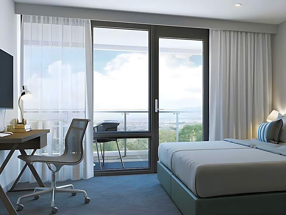 The Studio Suites offer views of the airport and feature a fully equipped kitchen with stove and microwave/oven, separate dining area for 4, a living area with a coffee table and a single sofa bed, which is available for a 3rd guest at an additional charge. The Studio Suite has a King Bed, full-height windows with private balcony, key card access, reverse cycle heating/cooling, complimentary WiFi, washing machine and dryer, in-room safety deposit box, digital concierge, IP TVs and movies on demand at an extra charge.