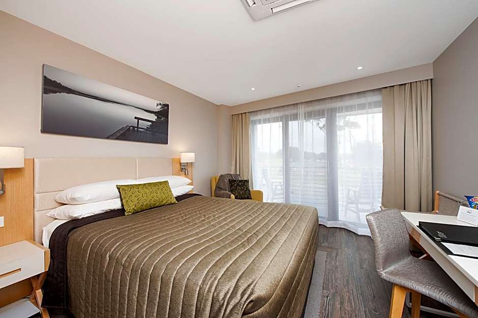 This room features a queen-sized bed, private balcony, kitchenette and air-conditioning.