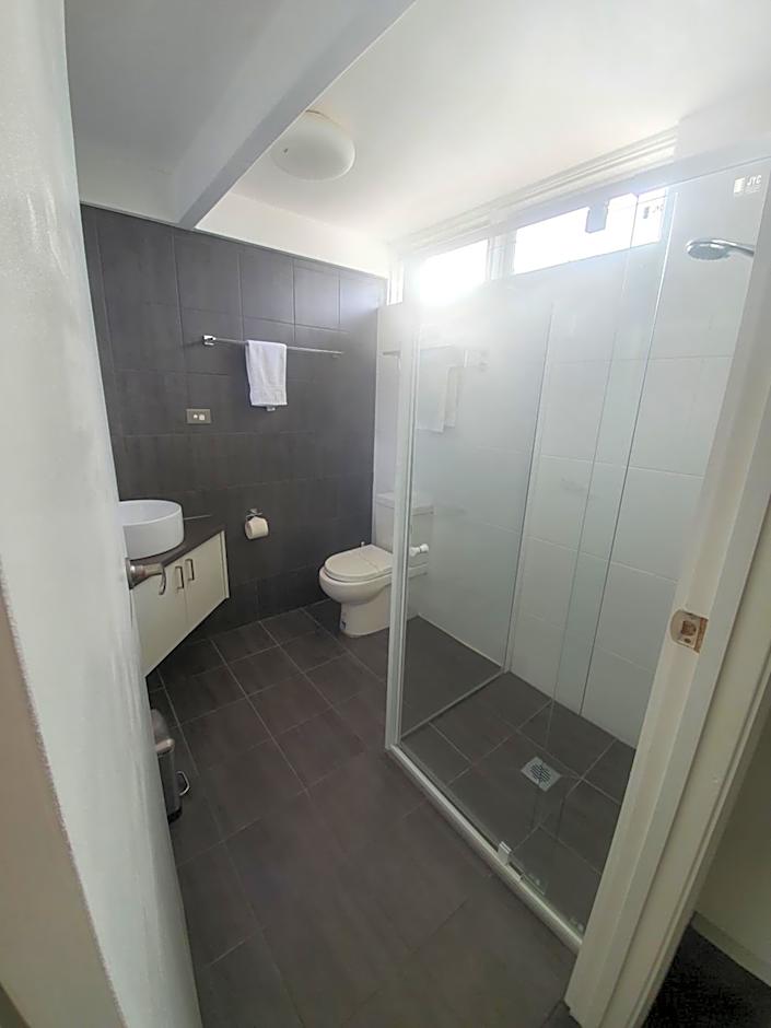 This room includes 2 bedrooms, both with heating/air conditioning. Also provided is a microwave, toaster, lounge area with a TV and an private bathroom. There is a covered parking space outside the room.