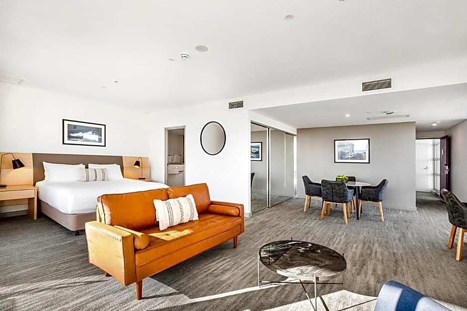 Located on the northern side of the hotel overlooking Wollongong CBD and escarpment, these suites include a king-size bed, and a double sofa bed. They offer a 40-inch flat-screen TV and a private balcony. The bedroom has an adjoining mini lounge area with a lounge set, second flat-screen TV. There is also a private balcony, basic kitchenette, fridge and 5 piece setting.