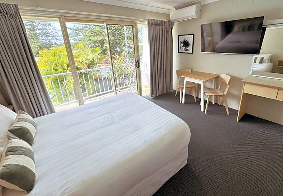 Our Queen Deluxe room offers a comfortable, air-conditioned retreat with a private balcony to enjoy the fresh air. Inside, you’ll find a Smart TV for your entertainment and a well-equipped kitchenette featuring a microwave, toaster, and tea/coffee-making facilities. Covered parking is provided for your convenience. These rooms are located upstairs on the first floor.
