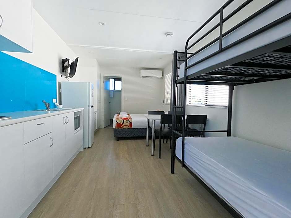 This 1-bedroom or open plan Cabin includes an private bathroom with a shower and a toilet. It also includes reverse-cycle air-conditioning/heating, a queen-size bed, and bunk beds.
