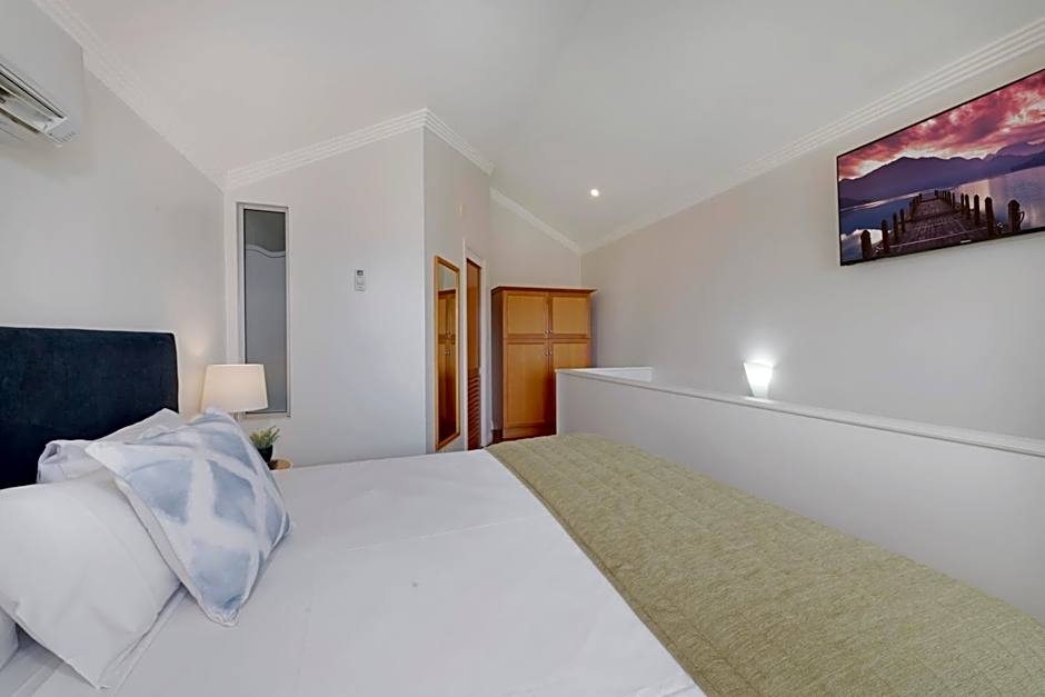 This split-level, air-conditioned apartment features a balcony, an private bathroom with a spa bath, an upstairs bedroom and a separate downstairs lounge area. It includes 2 LCD TVs, a fully equipped kitchen, 2 air-conditioners and a desk.