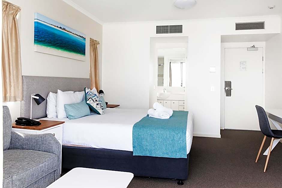 Modern style studio room with queen bed in living area, arm chair/s seating, complimentary tea & coffee sachets, kettle, small bar fridge, TV, Foxtel, Free Wifi and balcony with Ocean Views. 2 people max occupancy.