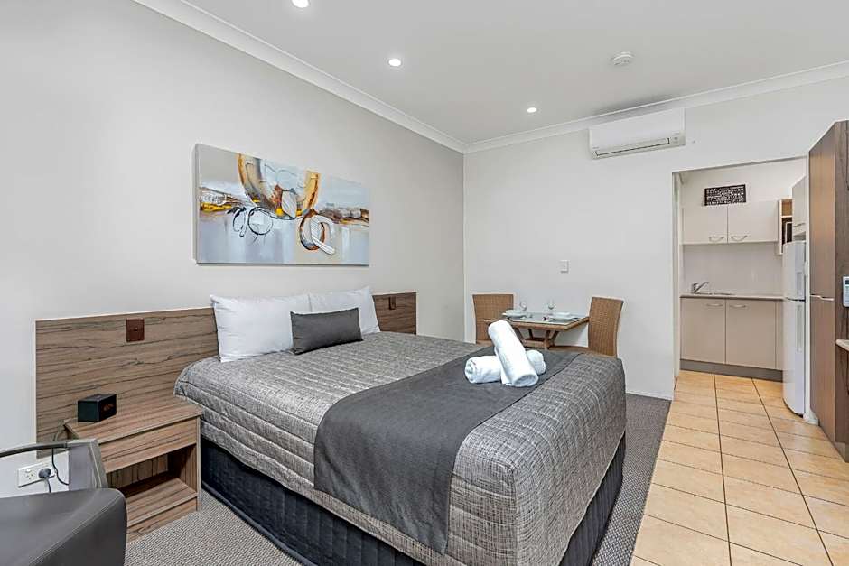 Our Studio Queen Rooms are stylish, spacious and comfortable and are perfect for corporate travelers and couples that prefer kitchenette facilities for their stay. Each room contains a queen-size bed, reverse cycle air-conditioning, flat screen TV, 16 digital Foxtel channels, wifi and a kitchenette with large fridge, hot plate, microwave, kettle, toaster. Tea/coffee making facilities and dining facilities are included with crockery and cutlery for 2 people.