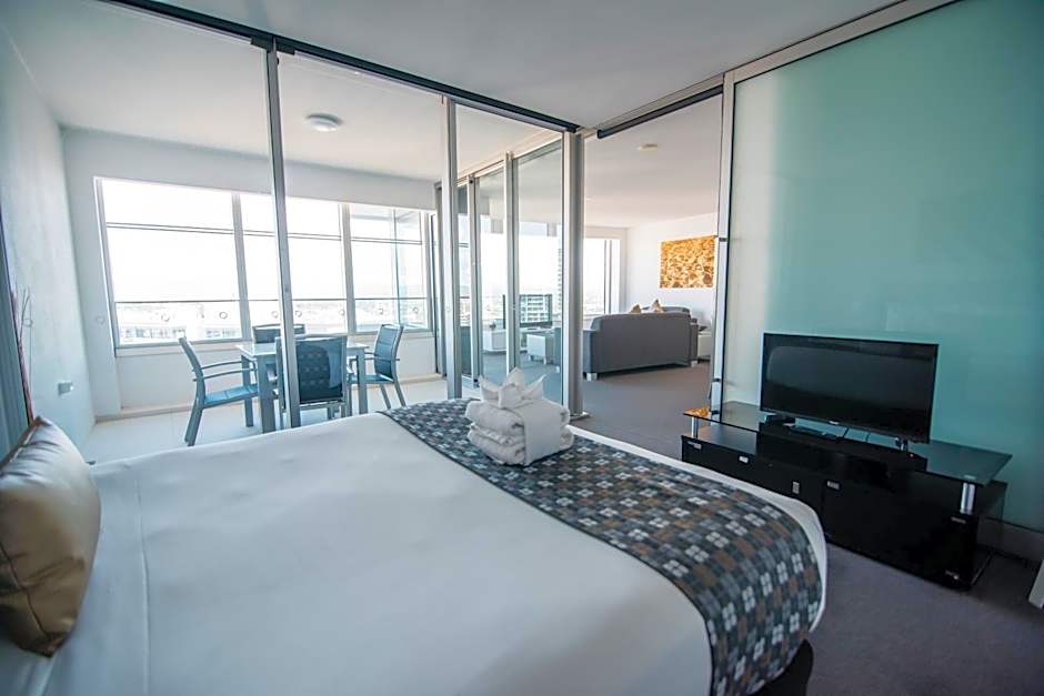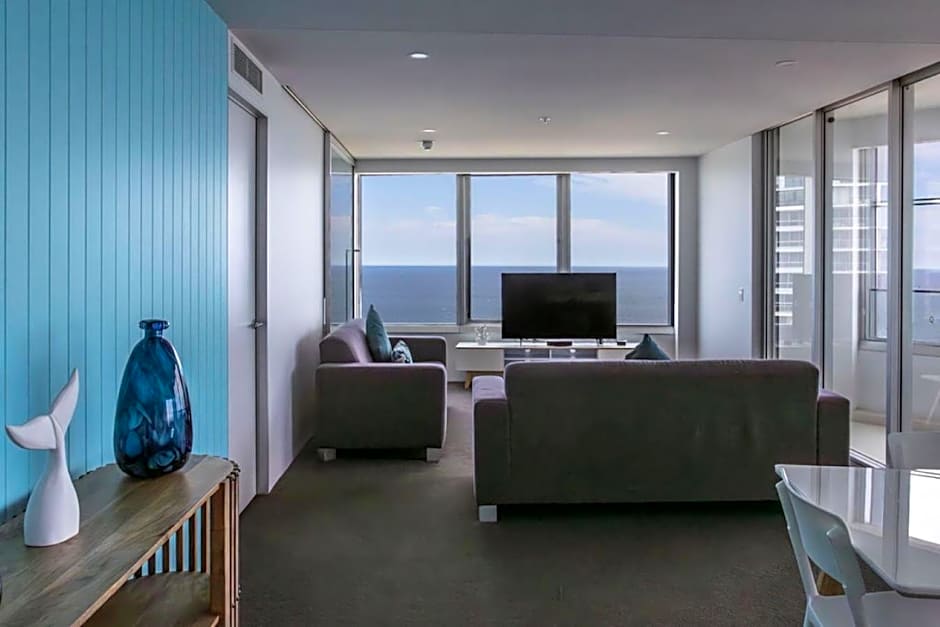 Located between levels 10 and 59, this 2-bedroom ocean spa apartment features spectacular ocean views. It offers a designer kitchen, unique and private glass enclosed balcony, spa bath, separate shower and laundry facilities. WiFi is available.