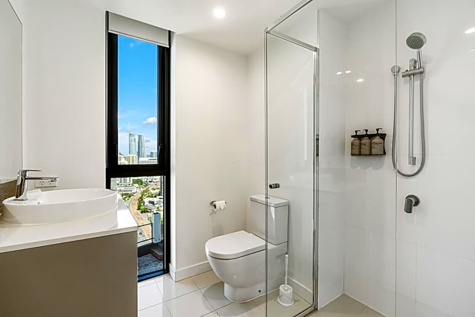 This 1 bedroom ocean view apartment offers an open plan living area with a shared kitchen, dining and lounge, separate bedroom and bathroom with a private balcony and floor to ceiling windows offering ocean and city views.The apartment offers a fully equipped kitchen with gas stove top, oven, microwave, dishwasher, cookware, crockery and cutlery and laundry facilities including a washing machine, tumble dryer, iron and ironing board. These apartments are located on levels 4 to 40.