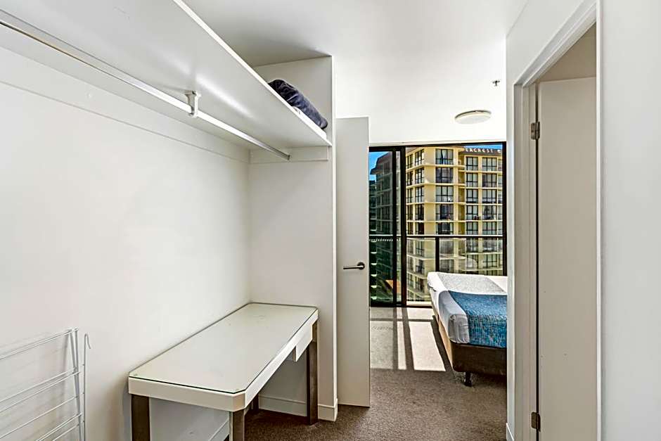 This studio has a shared bedroom, kitchen and dining with separate bathroom and floor to ceiling windows offering city views. The apartment offers a fully equipped kitchen with gas stove top, oven, microwave, dishwasher, kitchenware, crockery and cutlery and laundry facilities including a washing machine, tumble dryer, iron and ironing board. These studio apartments are located on levels 2 to 26.