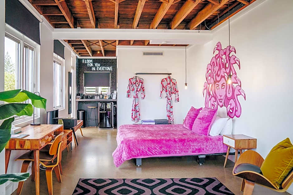 This room features a bedroom with en suite, chaise lounge and seating area and exposed timber ceiling. Also offered is a vinyl record player and two flamingo bathrobes. The room features a private balcony with views out over Coolangatta to Surfers Paradise. There is also a personal Bar with a SMEG fridge and custom neon and wall art as well as a hand painted bedhead wall art “The Flamingo Medusa” by Jamie Peters. Free WiFi is offered. You can enjoy room service from Eddies Grub House and access the rooftop.