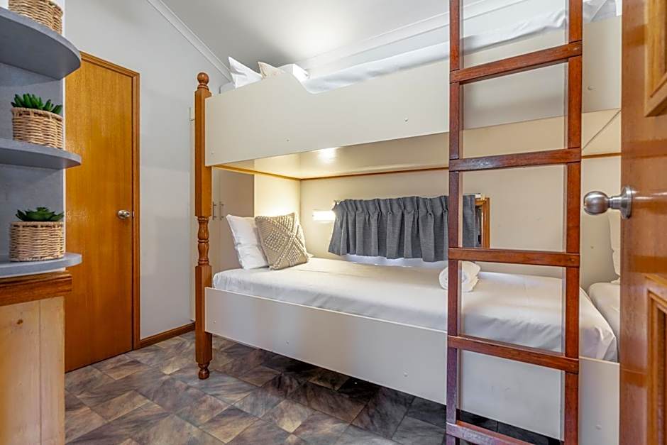 This open plan cabin offers an private bathroom, kitchenette and microwave, TV, air conditioning and a deck with outdoor setting. Located close to the pool and set in the award winning gardens.