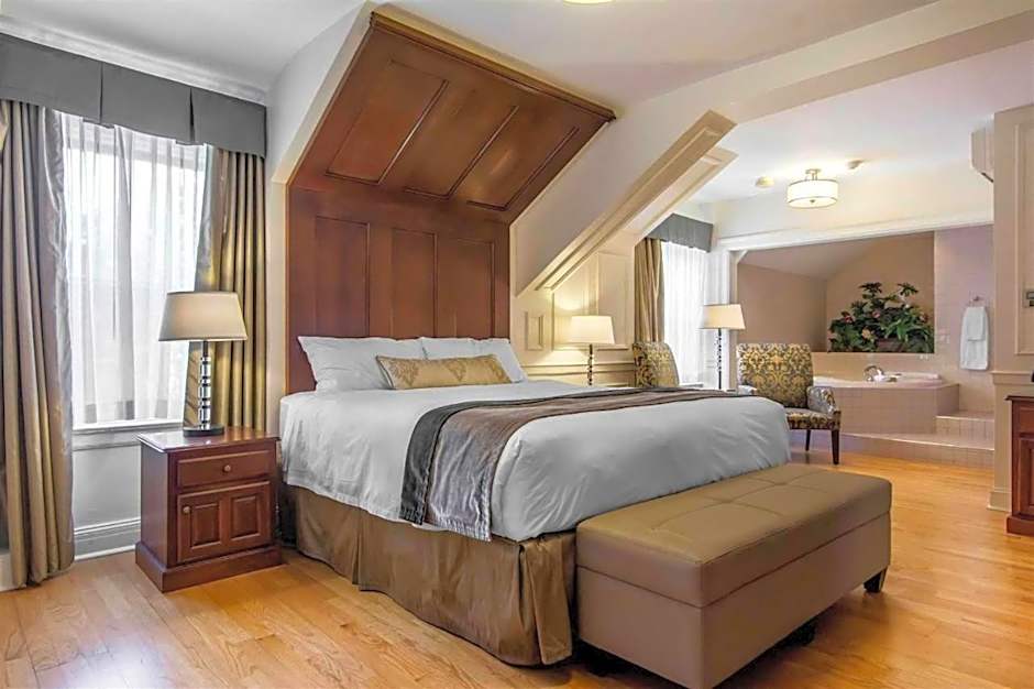 Hotel room with Queen bed and private bathroom with spa and separate shower. Offers a sink area with bar fridge, microwave, kettle and coffee pod machine (no toaster). Rooms located on the ground floor or up one flight of stairs; please contact the hotel in advance to request ground floor or upstairs preference. Street or parking lot view only.