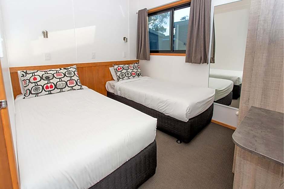 Discovery Parks - Renmark Riverfront offers a range of villa and cabin stays, many with river views and private outdoor seating. Options include the Villa, 3 Bedroom, River View; Deluxe Cabin, 3 Bedroom, Riverfront; Superior Cabin, 2 Bedroom, Riverfront; Villa, 2 Bedroom; and Villa, 2 Bedroom, River View, providing plenty of space for families or groups.