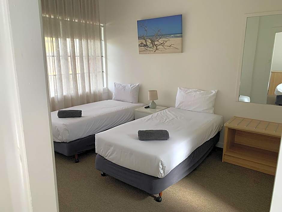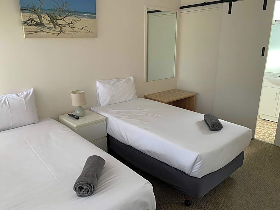 Deluxe Twin Rooms - These newly renovated twin rooms with all new appliances features a queen-size bed and a single bed (sleep 3 max). Rooms include private bathroom, air-conditioning, flat-screen TV, free wireless internet, a small refrigerator, tea and coffee making facilities, dining table with 2 chairs, microwave, crockery, cutlery, toaster, luggage rack, hairdryer and ironing facilities. Free onsite parking and all linen is included. There is no capacity for additional beds.