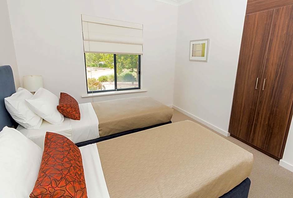 This modern serviced apartment has a balcony and golf course views. It offers a full kitchen, lounge, dining area, bathroom with spa, and 2 TVs. A third interconnecting room is available. Please note this apartment has some stairs.