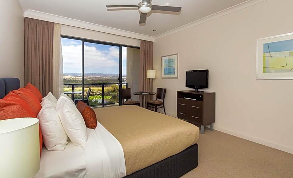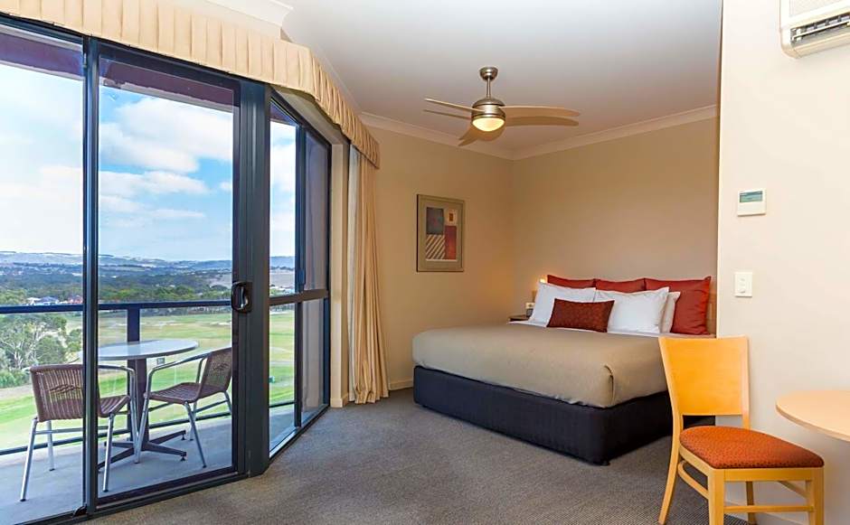 Relax on your balcony with pond and golf course views. This modern studio has a king bed, microwave, spa bath and tea/coffee making facilities. Please note this studio has some stairs.
