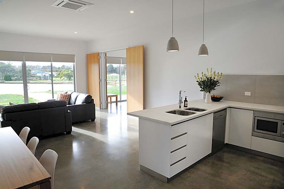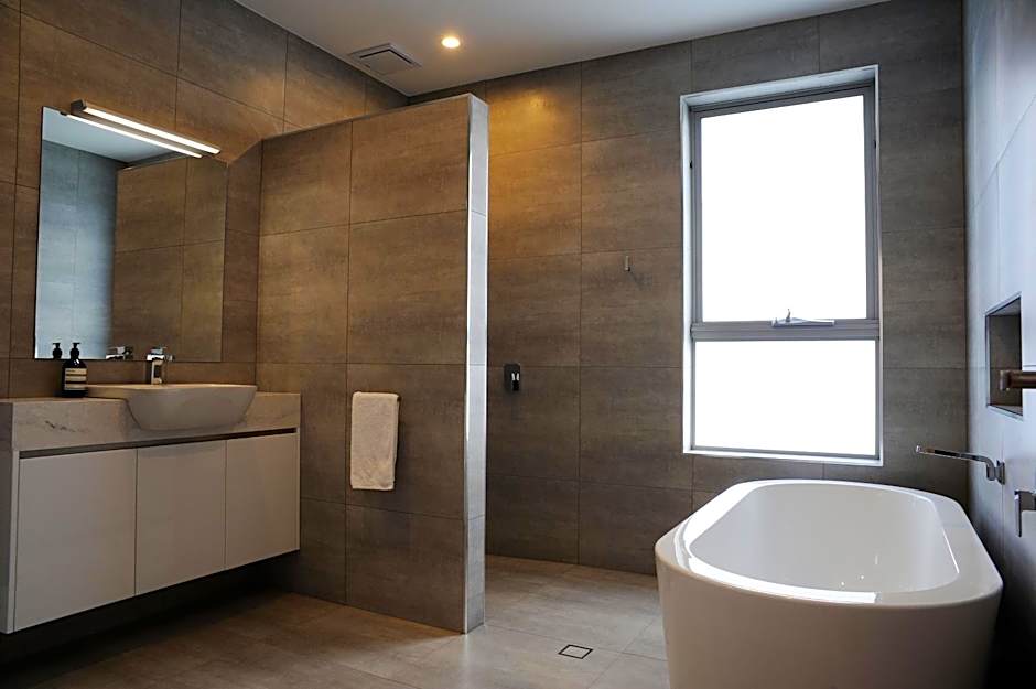This apartment features a fully-equipped kitchen and dining area with shared laundry. The living room features a flat-screen TV with Netflix and free WiFi. The bedroom has its own ensuite, one with a bath and walk-in shower and the other en suite with a mobility-access shower. All rooms overlook the private lake and surrounding landscapes.