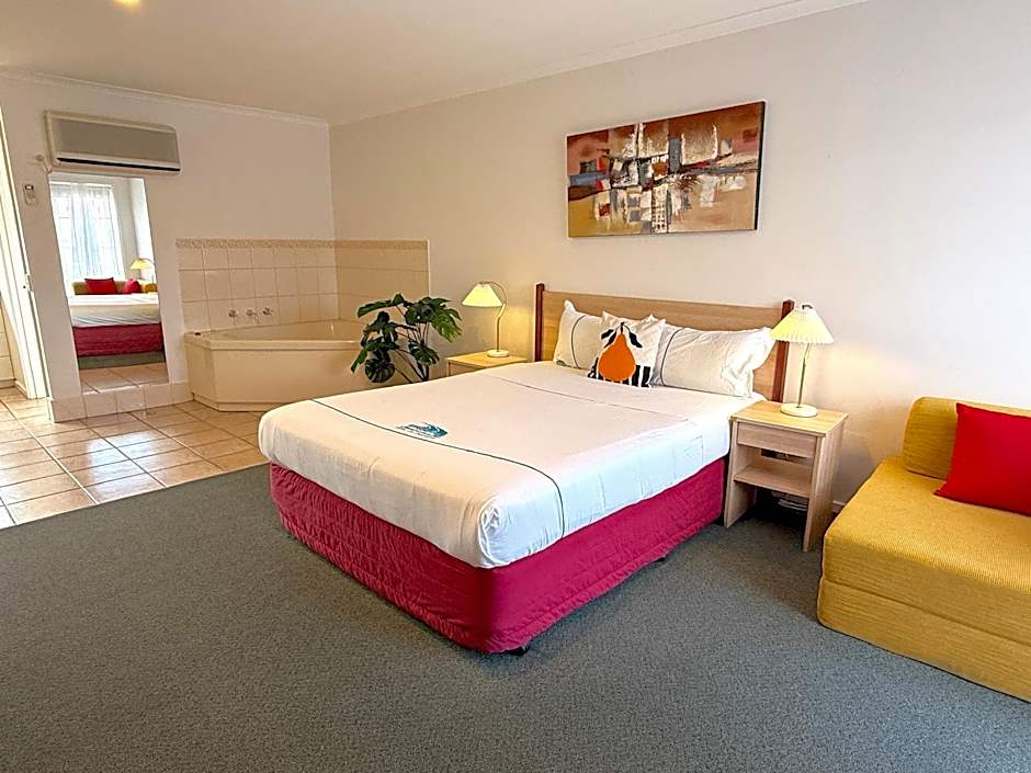 This spacious Family Apartment has a queen bed in the main area along with the TV, kitchen, lounge and dining area with the separate bedroom having a single bed and bunk bed. Bathroom has spa bath, shower, hair dryer plus usual amenities.