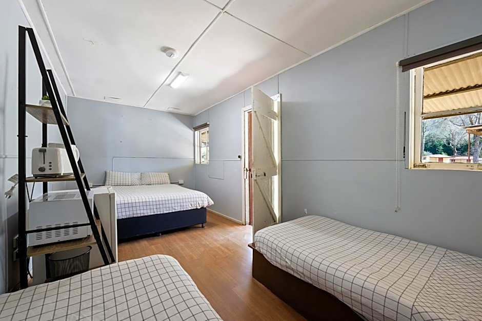 These rooms have 3 single beds. Guests have access to shared toilet/shower facilities and a camp kitchen. In the room there is a refrigerator, kettle, toaster, microwave, electric blankets, heater and linen.