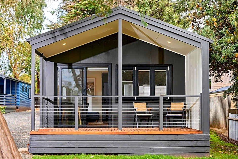 This new 2-bedroom villa features a queen bed in each room, separate toilet, en suite and spacious lounge area. There is a kitchenette with a dishwasher as well as air-conditioning in the main living area and fans in each bedroom. Guests can relax on the outdoor deck, and enjoy access to all our park facilities, including our games room, outdoor bbq area and saltwater swimming pool.