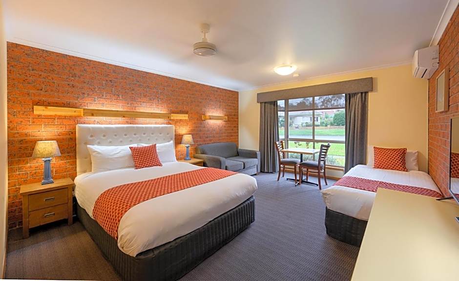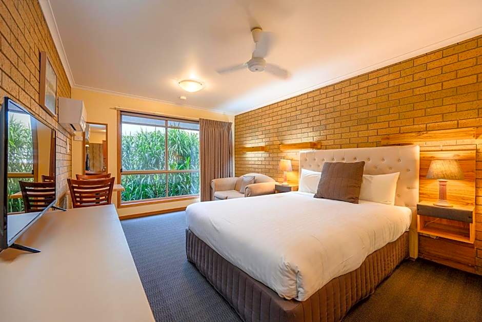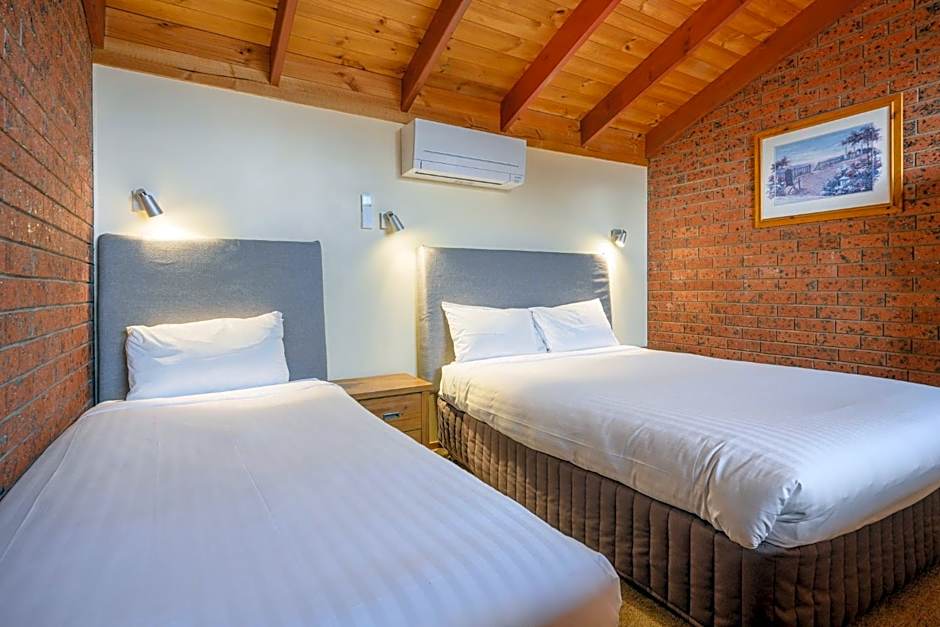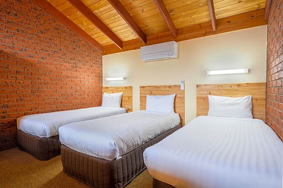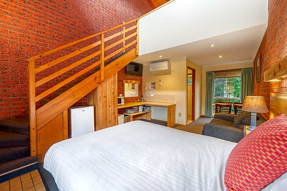 Includes stairs leading to a loft bedroom (with 3 single beds) overlooking the motel facilities.