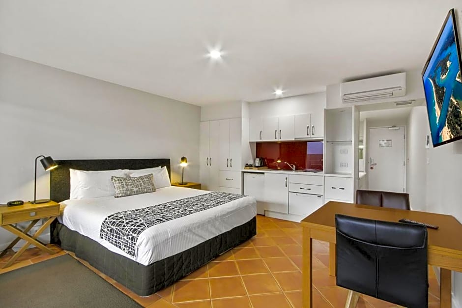 This spacious studio features a large 2-person spa bath, and kitchenette. The living area offers a flat-screen TV.