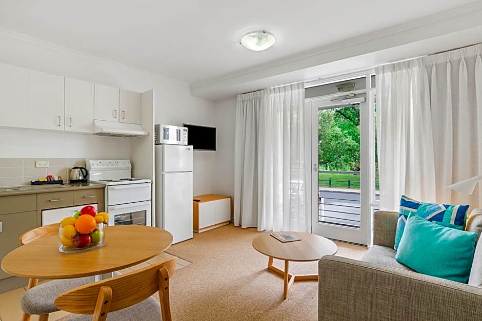 A Garden and various outdoor spaces provide relaxing spots to unwind. Accommodation options include Studio with a Queen Bed, Apartment layouts with 1 or 2 bedrooms, and Suites with a Queen Bed, offering a flexible mix of stays for different travel plans.