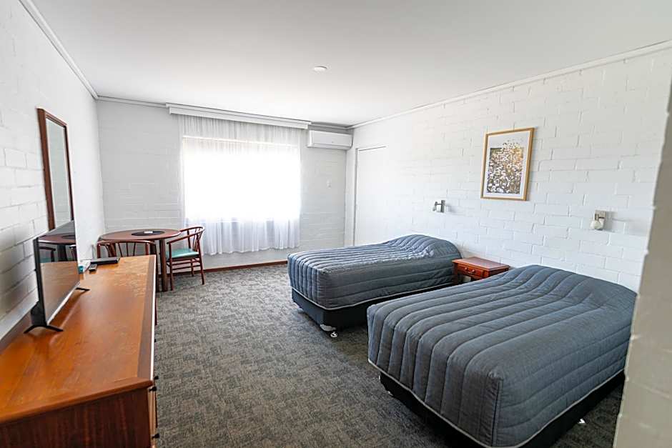 This standard motel style room has a queen and one single bed. There is a toaster, kettle, tea and coffee making facilities and a small fridge. The room is spacious and quiet.