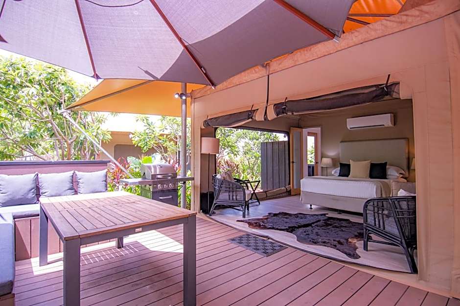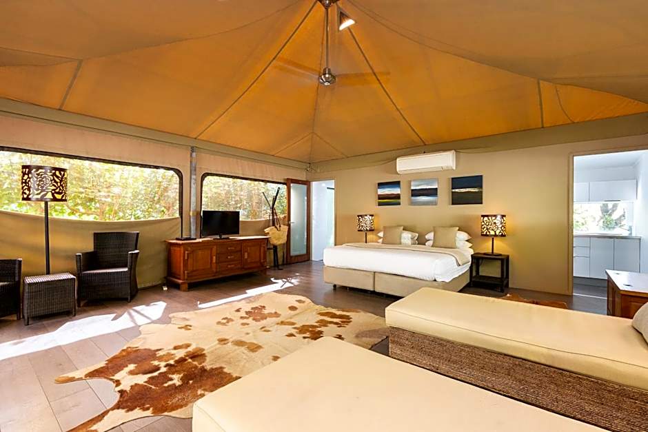 The Luxury Eco Tents are beautifully positioned under a large canopy of trees and is a truly sublime experience. The Luxury Queen Tent welcomes you with soft cowhides on the floor and original artwork on the walls. Offering a plush Queen size bed with an overhead fan, lovely cross ventilation and air-conditioning. It is self-contained with its own kitchenette on one side, with Nespresso Coffee Machine, tea & coffee provided, fridge, microwave and utensils. On the other side, there's an private bathroom with rain-shower over a free standing bath and hairdryer. Outside, enjoy a private outdoor deck with an upholstered seating area and a BBQ for entertaining. Children under two years of age are unable to stay in the tents.
