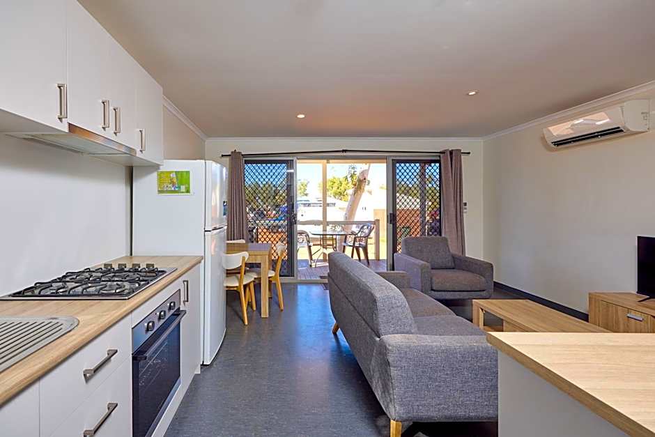 Accommodations facilities include a kitchen with fridge, stove top and microwave, open-plan living with TV, free Wi-Fi, plus an external private private bathroom. You will also be within a short stroll of our park facilities, including swimming pools, recreation room, camp kitchen, BBQ areas, laundry and more.