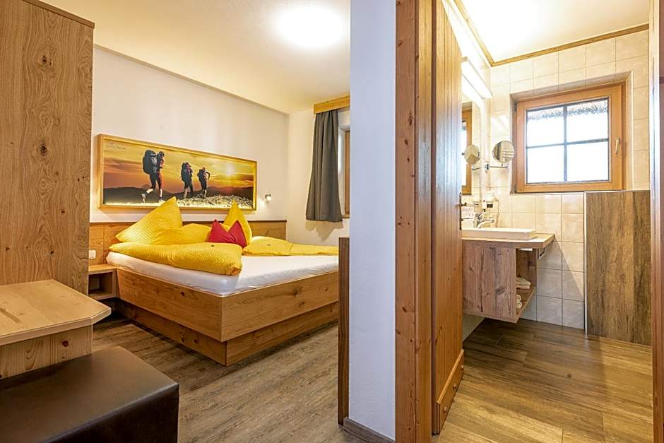 Bright, friendly double room with a desk, a seating area and a bathroom. The room features a balcony with views of the Zillertal Alps.