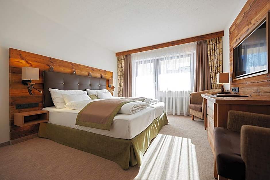 This luxurious junior suite for features modern, Alpine-style furniture, a south-facing balcony with views of the Widderstein Mountain, separated sleeping and living areas, and a bathroom with a shower, a bathtub, bathrobes, slippers and a hairdryer. Further amenities include a mini-bar, a safety deposit box, free WiFi and a spa bag.