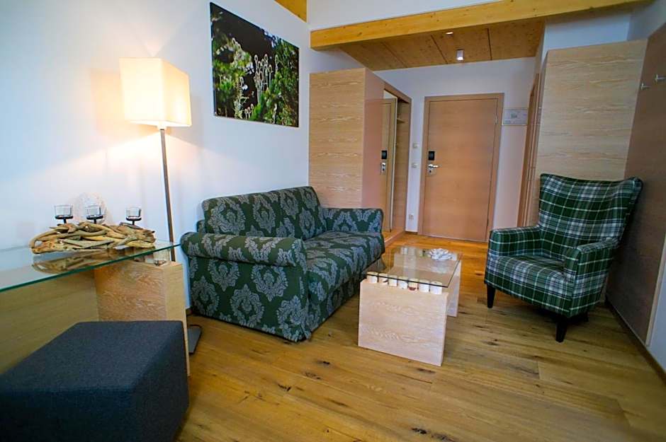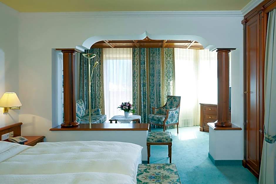 Very spacious suite with a south-facing balcony overlooking Seefeld, a double bedroom with a walk-in wardrobe and a make-up table, a twin bedroom with cable TV, a living room with a tiled stove, a flat-screen cable TV, a safe and a mini-bar, and a bathroom with a large bathtub and a separate shower.