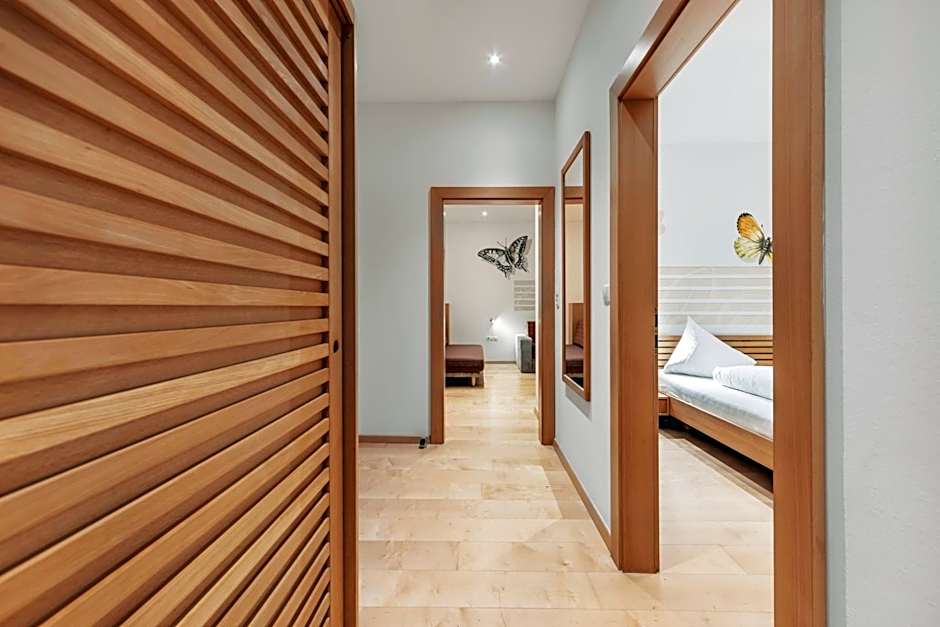 Featuring a south-facing balcony, this spacious apartment is elegantly decorated with light wood furniture and interiors.