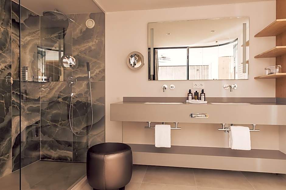 An all-season outdoor heated infinity pool with mountain views invites unwinding after a day on the slopes, with a sun deck and terrace offering panoramic alpine scenery. The pool access is complimentary for guests, making the return from the pistes extra refreshing.