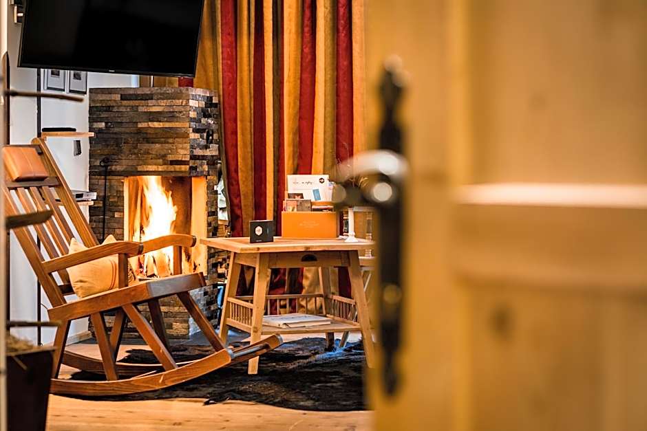 Very spacious room with a living area featuring an open fireplace, and a bathroom with a bathtub and a double washbasin. Some have a balcony overlooking the mountains.