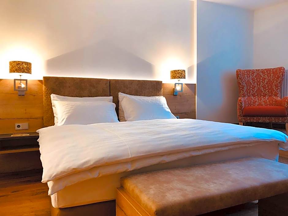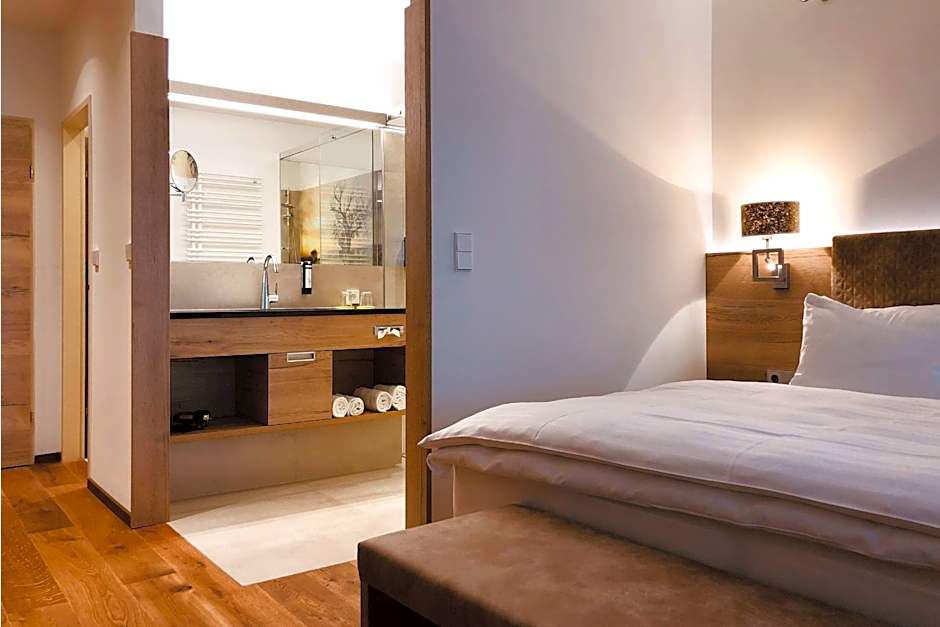 This double room features a large double bed with a pocketed spring mattress, a bathroom with shower or bath tub, and a separate toilet. The rooms are either east-facing or west-facing.