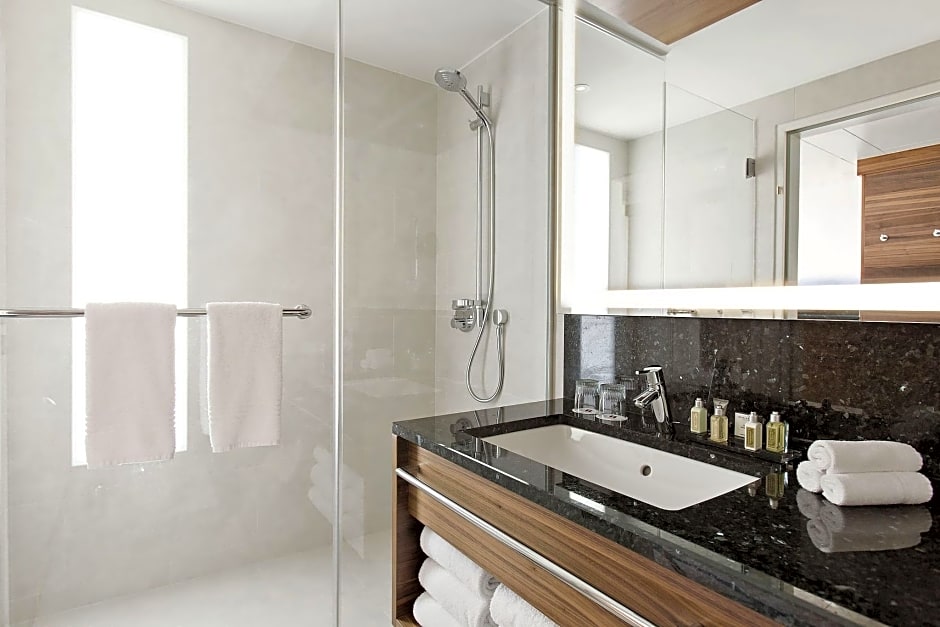 The Junior suite offers a bedroom with a King Size Bed, a living area with sofa and a bathroom featured with bathrobes, slippers and exclusive bathroom amenities, in-room coffee and tea-making facilities and complimentary water. Access to the wellness and fitness area with heated indoor pool and fully-equipped gym is included. A benefit from exclusive services with the included M Club Lounge access.