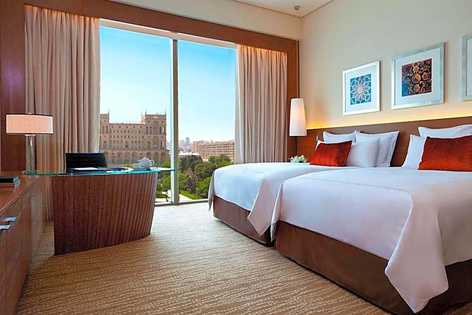 Deluxe Sea View Rooms maintain modern luxury design while infusing a stylish, Azerbaijani feel. Featuring breathtaking views of the Caspian Sea and Baku’s inspiring skyline, this bedroom features two double beds with Marriott bedding, pillow menu, working desk, and a marble bathroom.