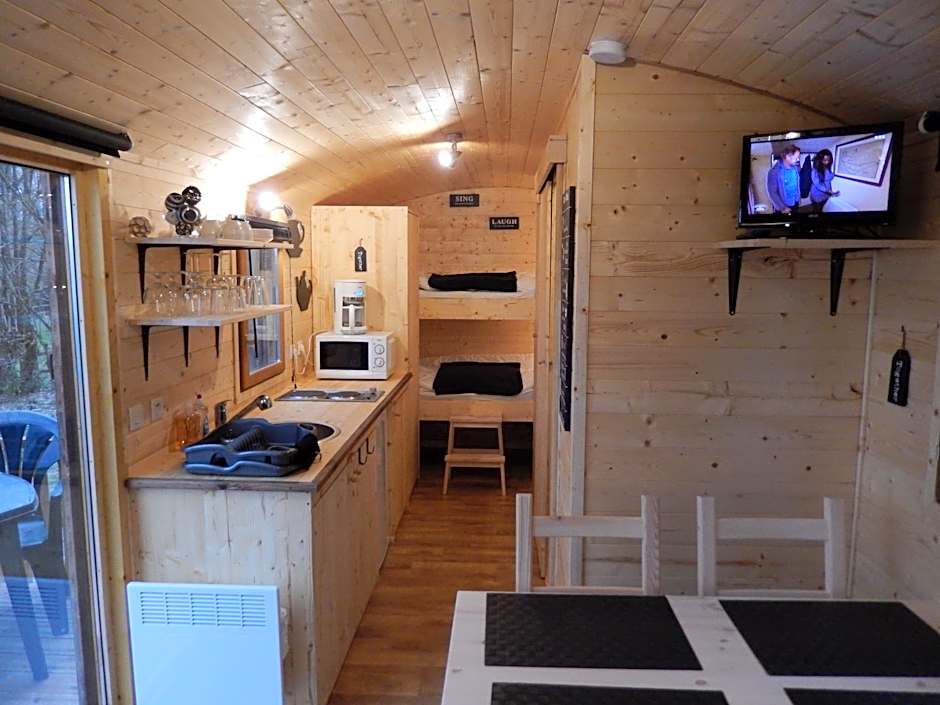Wooden caravan including a seating area with a flat-screen TV and a DVD player. It also has a well-equipped kitchen with a coffee machine.