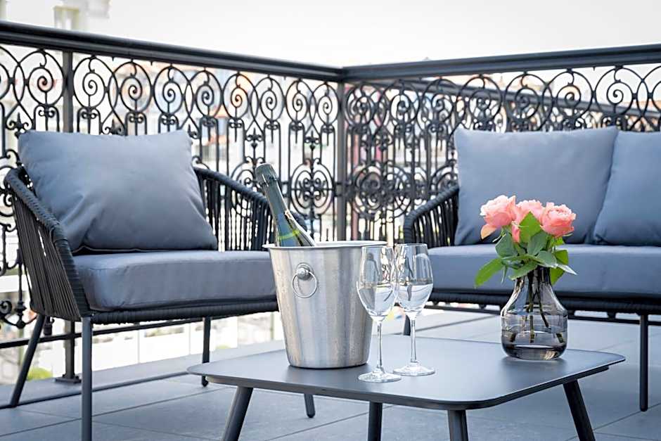 Hotel des Brasseurs offers a variety of room types including "Signature" Rooms with Terraces, Deluxe Rooms with Terraces, Large Double Rooms, Deluxe Rooms, Signature Rooms, and Superior Rooms with Terraces. All rooms are double occupancy and do not allow smoking. Each room is equipped with a king-sized bed.