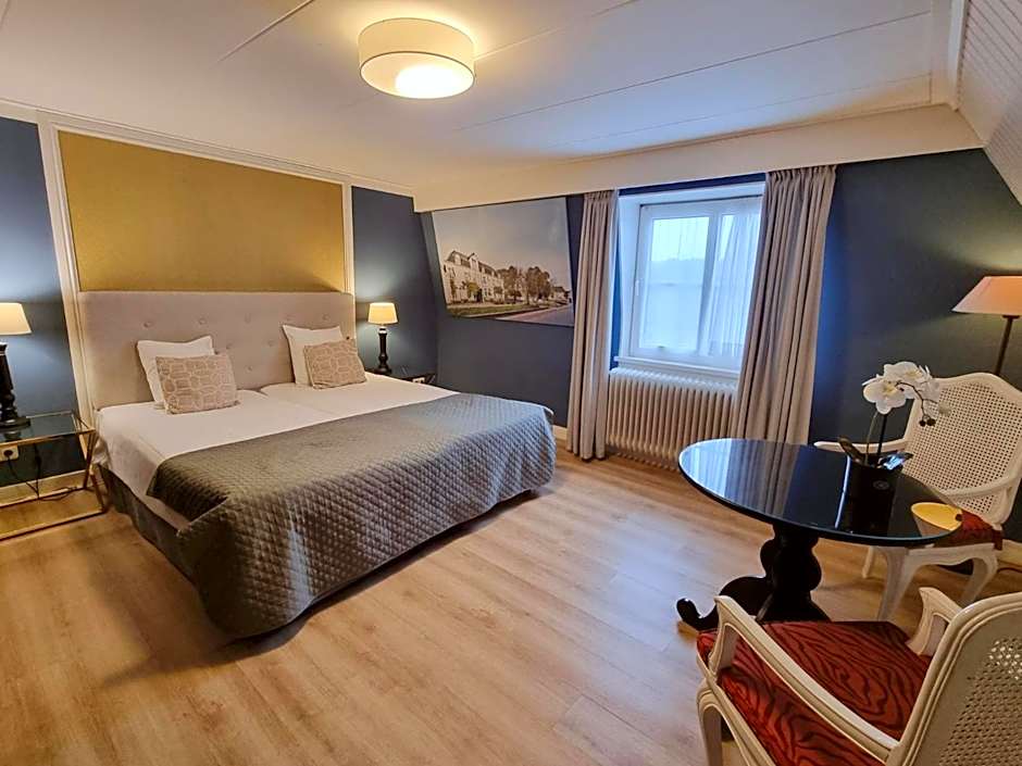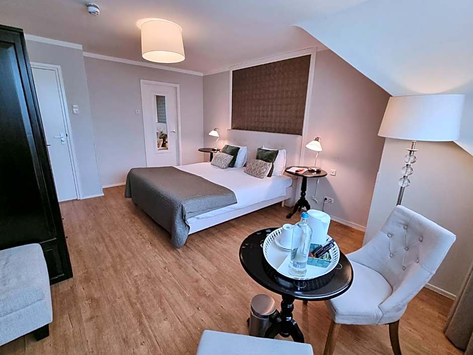 This suite is located at the side of the building and therefor has its private entrance. It has a large seating area with a TV, 2 separate bedrooms which can be reached by stair on the first floor. Also on the first floor is the second separate toilet. The bathroom is equipped with a bath and shower.